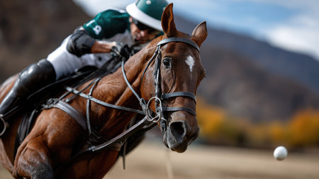 A thrilling scene capturing a polo player in full motion on a brown horse, showcasing the intensity and excitement of the sport against a picturesque backdrop.