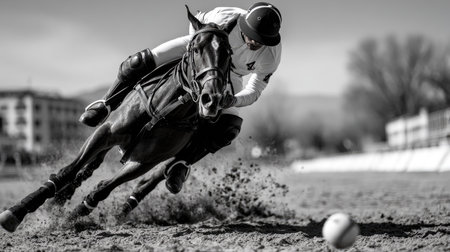 This dynamic grayscale image captures a polo player in action, leaning low on their horse as they navigate the field during an intense match, showcasing skill and agility.