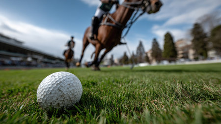 A detailed close-up of a golf ball resting on lush green grass, with polo players in dynamic motion in the background showcasing the thrill of equestrian sports.
