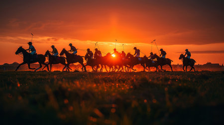 An exhilarating polo match showcases skilled riders galloping on their horses, emphasizing teamwork and speed. The vibrant outdoor event captures the thrill of the game.