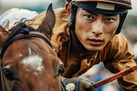 AI Generative Man jockey rider at hippodrome sports horse racing, summer Olympic games competition