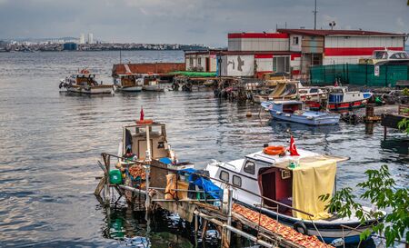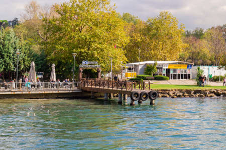 Istanbul, Turkey - October 6, 2019: Sunny sea landscape with wooden pier for boats