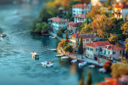 A picturesque lakeside village with colorful houses, red rooftops, and small boats on the water, creating a serene and charming ambiance.