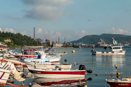 Zonguldak eregli district, fishing boats and erdemir iron and steel factory behind, June 24,2020, Eregli, Zonguldak, Turkey