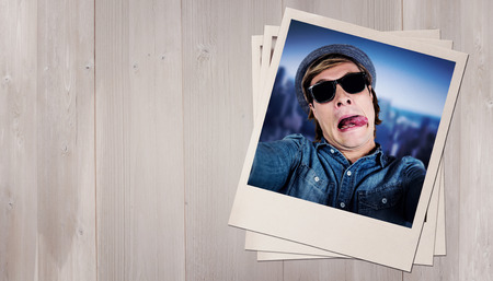 Five blank photo prints in a row on a wood desk or table. Space for copy. Paths provided.