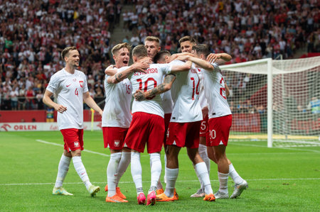 WARSAW, POLAND - JUNE 16, 2023: Friendly football match Poland vs Germany 1:0. Team of Poland joy after scoring goal.