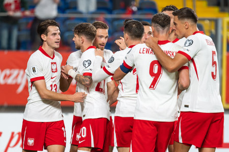 CHORZOW; POLAND - SEPTEMBER 7; 2025: Qualifications for FIFA 2026. Football match Poland vs Finland. Joy Jakub Kaminski (L) Matty Cash (M) polish team after scoring goal