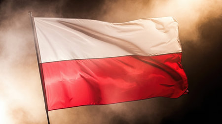 Poland national flag waving against dramatic smoky sky background.