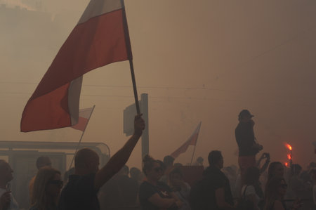 Warsaw, Poland 11.11.2020 - Independence day march on 102nd anniversary in Warsaw. Crowd of people marching with polish flags and red flares . High quality photo