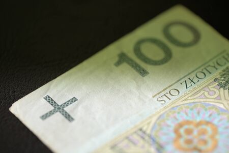 One hundred Polish zloty banknote on a dark surface close-up. Money background green color toned