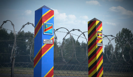 Border posts with flags of Democratic Republic of the Congo and Uganda - 3d illustration