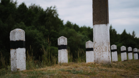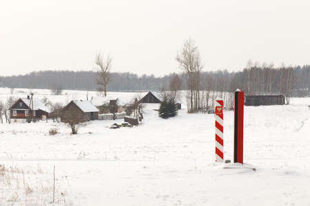 Boundary pillars of Belarus and Poland on the border in a winter field
