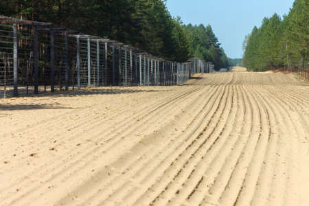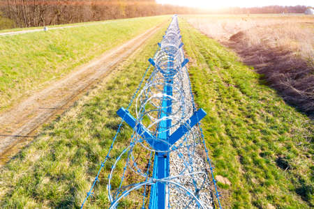 Barbed wire stretches along a dirt path, defining the boundary of an open field. The landscape features green grass and distant trees beneath a clear sky, creating a stark visual contrast.