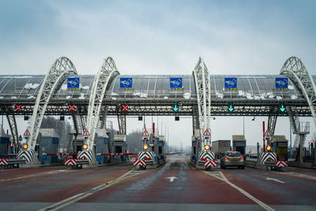 Point of acceptance of payments on the carriageway. Busy toll road, with many cars queuing up to pay tolls.