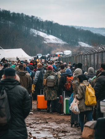 Families and individuals lined up at a border, carrying bags, hopeful for a better future while facing hardship and uncertainty.