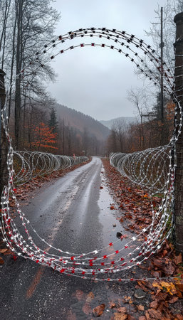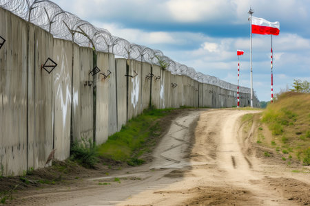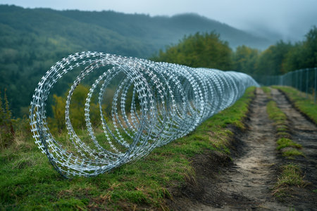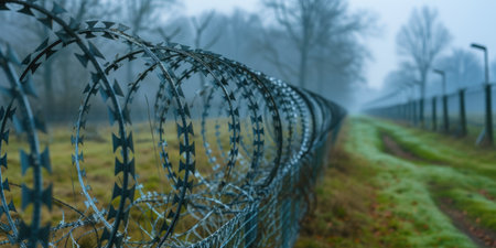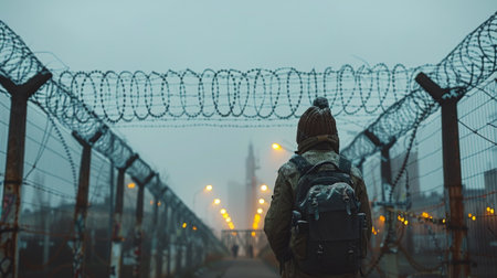 Soldier patrolling along a fortified border fence with barbed wire, ensuring safety and protection in a restricted area