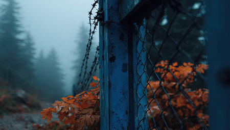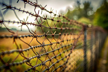 Eerie barbed wire fencing in desolate field under cloudy sky