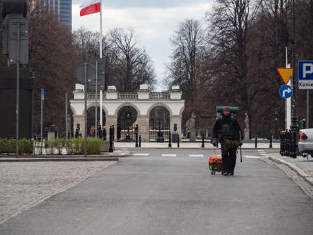 Warsaw/Poland. Streets of capital during coronavirus pandemic, usually very crowded with people or cars, now empty. Tomb of the unknown soldier and in front homeless walking the street.