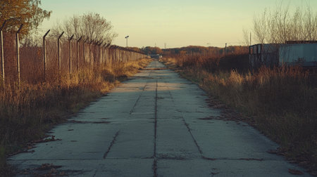 A deserted concrete road cutting through an industrial area with high fences and no vehicles.