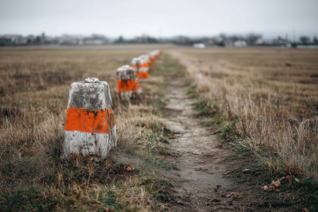 Rows of markers stand beside a dirt path that cuts through a grassy field. The sky is gray with clouds, and some buildings are visible in the distance.