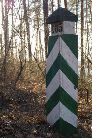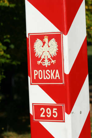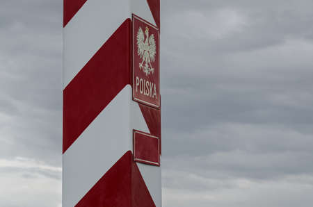Polish, white and red border post. The Polish eastern border is also the border of the European Union, NATO. On the pole, there is a white eagle with a golden crown, sign Poland and number 1