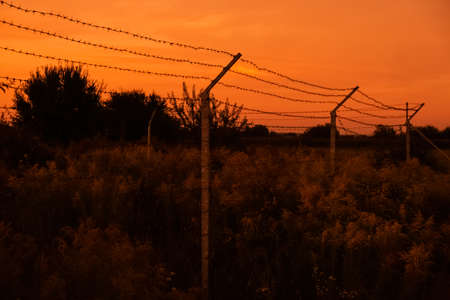 Security Fence In Prison. Lost freedom behind barbed wire. Law. Old rusty barbed wire in the forest close up. Private property. Wire fence, barbed, ant. Copy space.
