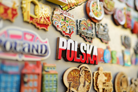 WARSAW, POLAND - AUGUST 2021: Assorted colorful magnets sold on souvenir shop in Warsaw Old Town. Typical souvenirs sold to tourists in Poland.