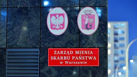 Warsaw, Poland. January 21, 2026. Urban landscape after dark. Neon sign with the inscription: Zarząd Mienia Skarbu Państwstwa.