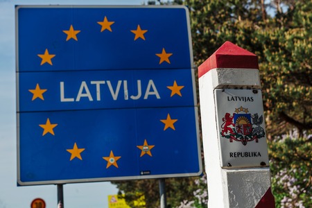 Border sign of Latvia located on the border between Latvia and Lithuania.