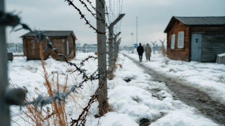 A haunting winter scene featuring a barbed wire fence alongside a snowy path that leads to wooden sheds, capturing a moment of reflection and history.