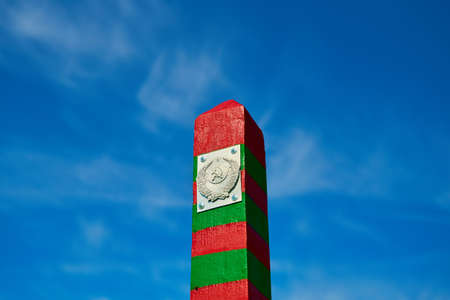 Latvian border post displaying the national emblem and inscription LATVIJAS REPUBLIKA, Republic of Latvia