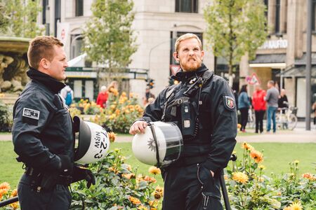 German police officer. Riot Police Germany. Police patrolling in dusseldorf October 27, 2018. German policemen Polizei at work. The subject of law enforcement, public protection, utilities in Europe.