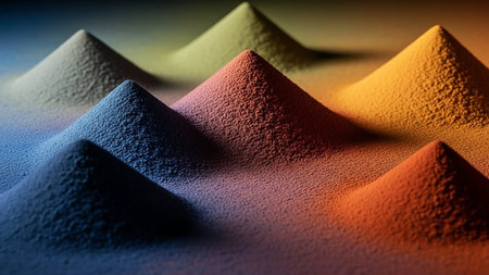 Close-up of colorful powder piles in cone shapes, arranged in a gradient of hues, showcasing a vibrant and granular texture.