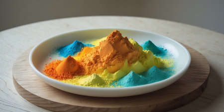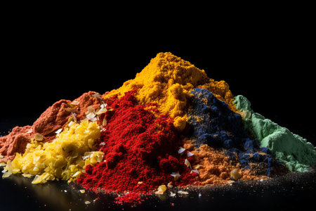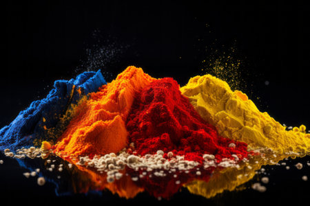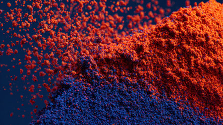 This striking image features vibrant piles of colored powder in red, blue, and orange, creating a visually captivating scene on a dark surface.