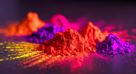 Vibrant colorful Holi powder piles on dark surface celebrating festival.