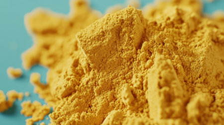 A closeup view of fine yellow powder displaying a soft texture against a vibrant blue background, perfect for artistic or culinary projects.