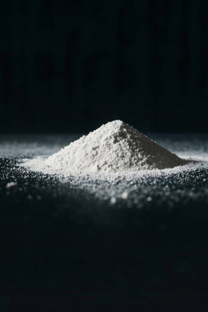 Kaolin on black isolated, powdered background. Kaolin is a mineral of inorganic constitution, chemically inert, extracted from deposits and processed in different granulometric bands. Used in the food industry, paper and inks