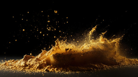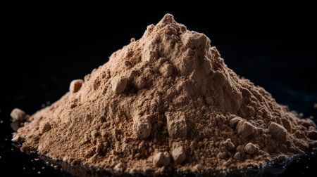 A sizable mound of brown powder sits on a dark surface, showcasing its fine texture. This powder could represent various natural ingredients commonly used in culinary applications.