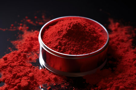 Close-up of intense red powder burst with dynamic scattering around a metallic container