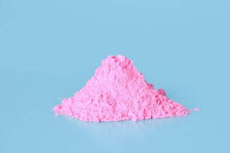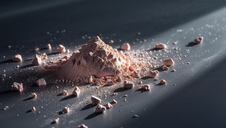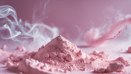 Pile of light pink powder is scattered on a pale pink surface. The powder has a loose, crumbly texture.