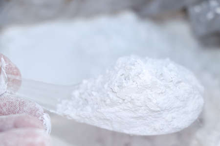 Detergent powder with measuring spoon for clothes washing. Laundry concept.