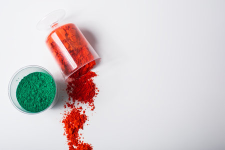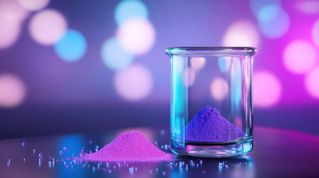 Vibrant chemical powders arranged in test tubes and beakers showcase a modern laboratory setting, ideal for experiments and scientific studies in various applications.