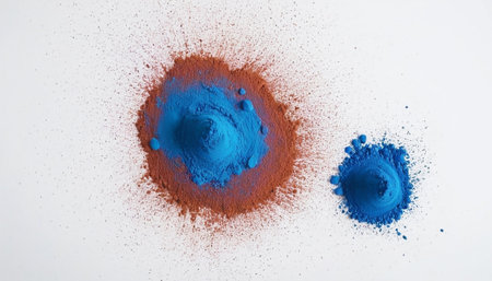 Fine particles of bright orange and deep blue powders interact, forming captivating shapes as they scatter in mid-air, showing beautiful color contrast.