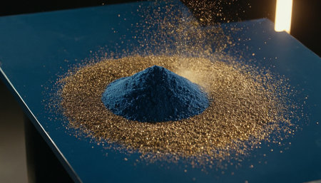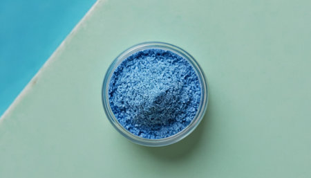 Blue pigment granules. Close-up of vibrant blue powder with spherical granules and hints of bronze dust on a dark background, creating a textured and striking visual.