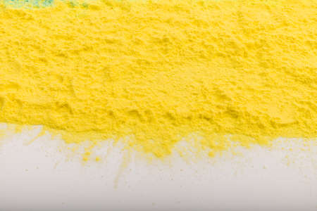 Yellow background from holi powder paint. Indian festival of colors Holi. Abstract powder splatted on white background.