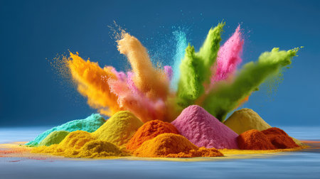 A captivating display of vibrant colored powder bursts into the air, creating an artistic scene. The blue background enhances the rich colors, perfect for celebrations.