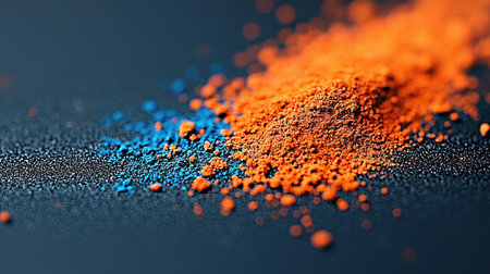 Close-up view of vibrant orange and blue powder scattered on a black surface, capturing artistic beauty and vivid colors for creative projects and design work.