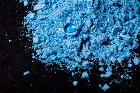 Blue pigment powder close-up. Macro shot of vibrant blue powder particles forming textured mounds on a dark surface with dramatic lighting.