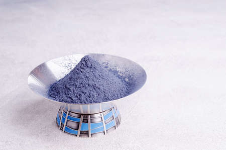Dry blue powder in a metal bowl. Traditional Japanese tea. selective focus.
