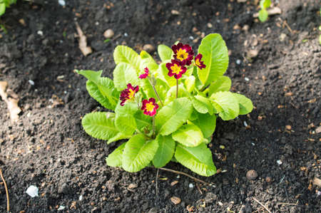 Spring flowers primula in green grass with sunny light. Bush red color at flowerbed side view.
